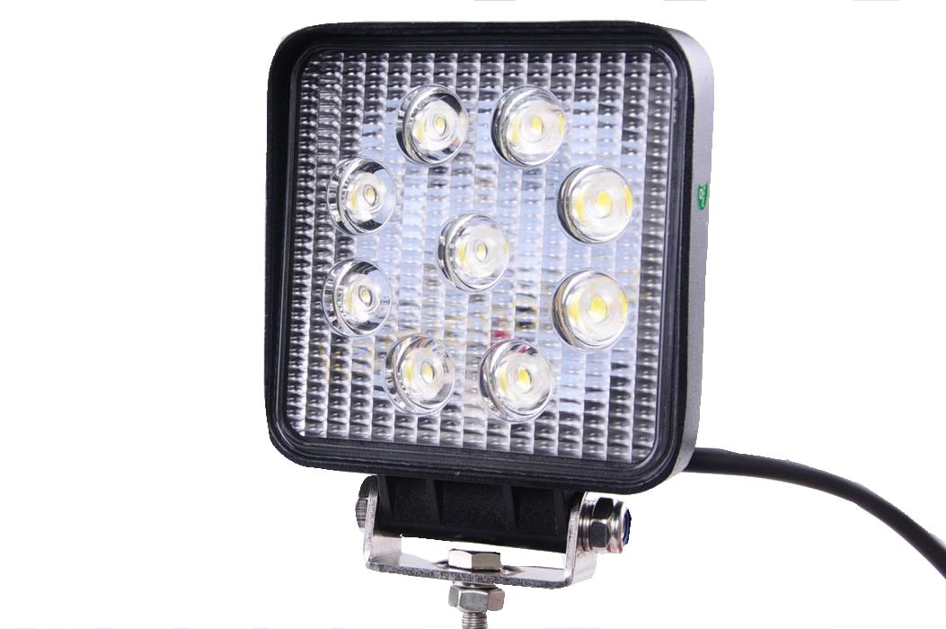 Světlomet LED 27W pracovní čtvercový 10-30V - širokoúhlý, disponuje vysokým světelným tokem. Upevnění světla na konzoli se šroubem M8.