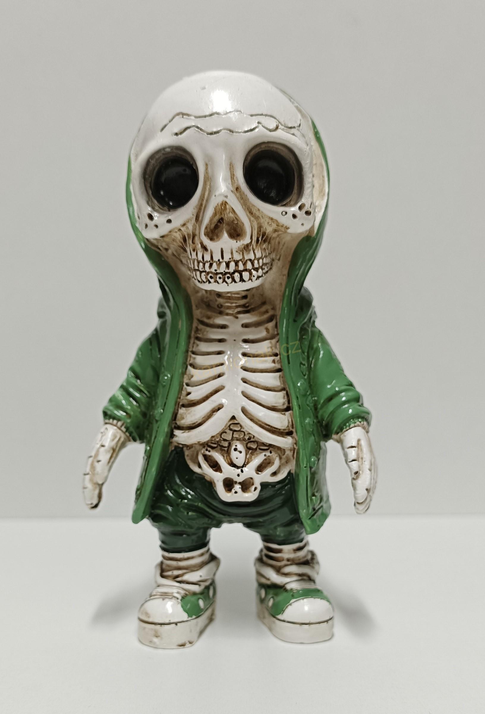 KOSTLIVEC - zelený je dekorativní postavička kostlivce určena do vnitřního prostředí a vyrobena s pryskyřice. Ideální na palubní desku vozu.