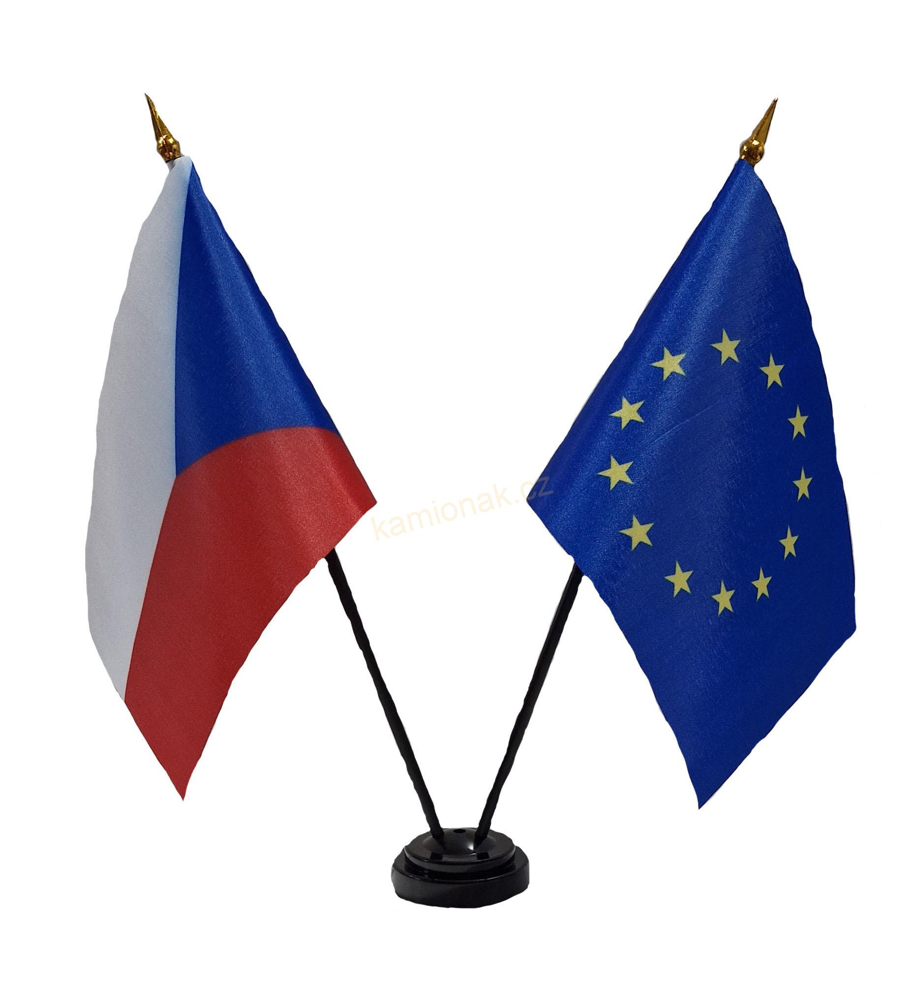 Vlaječky CZECH / EU - je sada dvou kusů dekorativních vlaječek, dvou kusů ozdobných stožárků a stolního podstavce.